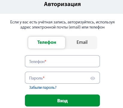 - Подраздел «Телефон» требует введения номера мобильного телефона и пароля, полученного при регистрации. Для открытия персонального аккаунта выбираем кнопку «Вход».