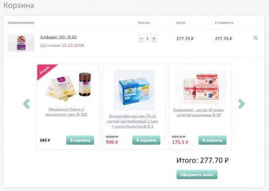Выбрав необходимое количество товара, кликаем «В корзину». В правом верхнем углу находим кнопку «Оформить заказ». Здесь мы увидим предварительный заказ, общую стоимость и рекомендации к покупке. Если всё верно, кликаем «Оформить заказ».
