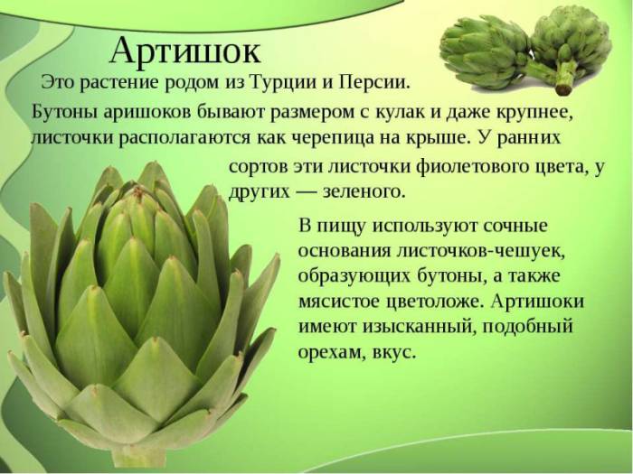 Для пищевых целей используется нераспустившаяся цветочная почка артишока. Она состоит из плотных мясистых чешуек, которые при термической обработке приобретают приятный насыщенный вкус. В некоторых кухнях мира используют и более позднее шишки растения, но это редкость. Размер не играет роли. Небольшие экземпляры используются для канапе и засолки, средние – под жарку, тушение и салаты. Выбирая артишок для готовки, отдавайте предпочтение равномерно зеленой почке, не имеющей увядших или сухих чешуек.