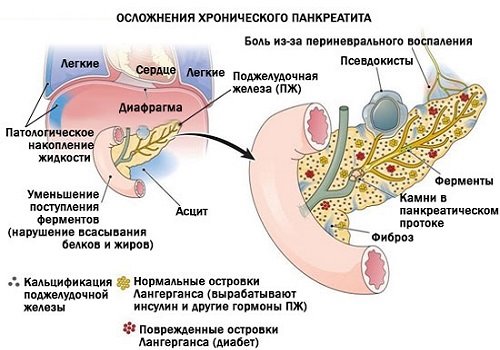 В зависимости от причины, хронический панкреатит имеет различное течение и отдаленные осложнения. На начальной стадии заболевания обычно возникают рецидивирующие эпизоды острого панкреатита, а через разное время (от лет до десятилетий) появляются симптомы экзокринной и эндокринной недостаточности поджелудочной железы.