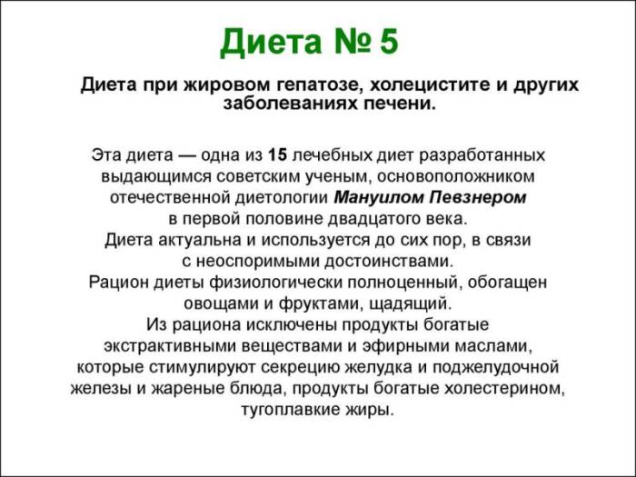 Диету №5 для больных жировым гепатозом разработал советский врач Мануил Певзнер. Достоинство лечебного питания: