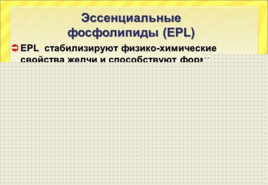 Эссенциальные фосфолипиды соответствуют по своей структуре эндогенным фосфолипидам, но превосходят эндогенные фосфолипиды по активности за счет более высокого содержания в них полиненасыщенных (эссенциальных) жирных кислот.3,6 Под воздействием эссенциальных фосфолипидов в печени при жировом гепатозе также снижается выраженность стеатоза.3,6,7