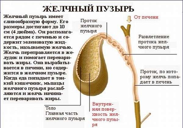 Желчный пузырь по форме подобен груше и находится он на висцеральной поверхности печени в специальном углублении, которое разделяет две доли печени. В анатомии желчного пузыря выделяют три отдела: дно, тело, шейку. Дно органа располагается возле нижнего края печени, а шейка обращена в сторону ворот железы и находится совместно с протоками в дупликатуре печеночно-дуоденальной связки.