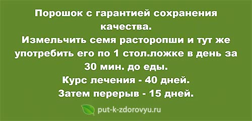 Порошок получают перемалыванием семян в кофемолке. Так как он не хранится долго, то лучше перемалывать их маленькими порциями из расчета на день. Принимать по 1 чайной ложке 2 раза в день за 30 минут до еды. Курс лечения – 1 месяц.