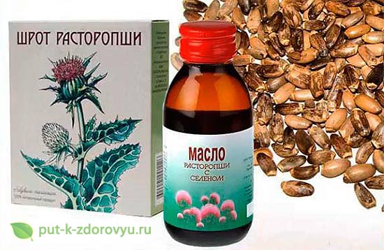 В процессе холодного отжима перемеленых семян расторопши пятнистой получают масло и шрот – вещество в виде порошка растения, богатого клетчаткой. Шрот словно «щетка» очищает кишечный тракт, способствуя стимуляции его работы и нормализации полезной микрофлоры.