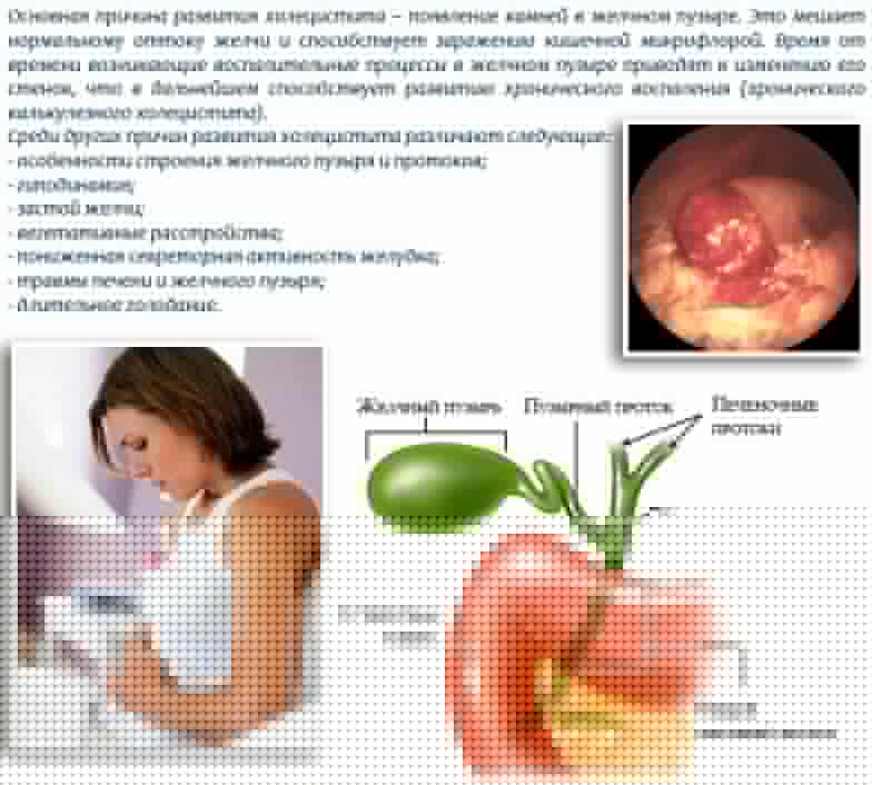 Причиной острого холецистита является поступление патогенных микроорганизмов в желчный пузырь. Это связано с тем, что у беременных женщин часто есть проблемы с желудочно-кишечным трактом: уменьшается кислотность желудка и моторно-эвакуаторная функция кишечника, а также снижаются местные иммунные силы – все это способствует легкому попаданию возбудителя в желчные пути, а затем и пузырь, что сопровождается развитием инфекционного процесса в желчном пузыре.