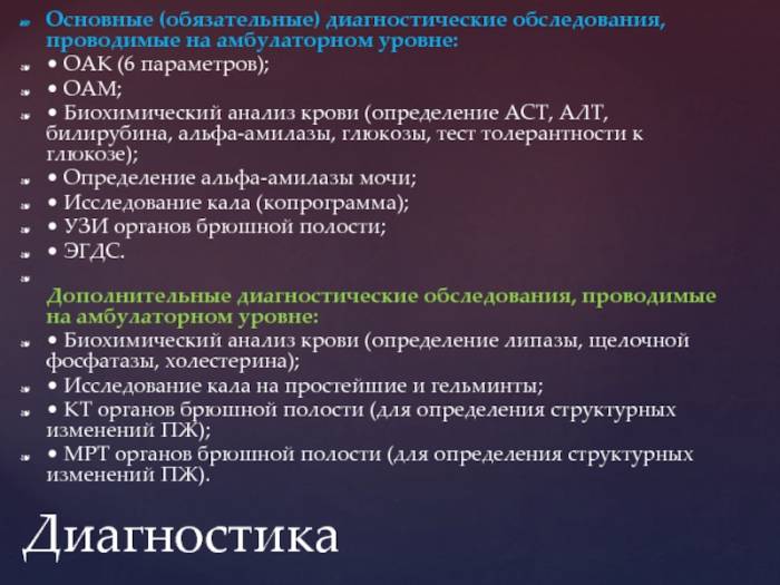 ОАМ;• Биохимический анализ крови (определение АСТ, АЛТ, билирубина, альфа-амилазы, глюкозы, тест толерантности к глюкозе);• Определение альфа-амилазы мочи;• Исследование кала (копрограмма);• УЗИ органов брюшной полости;• ЭГДС.