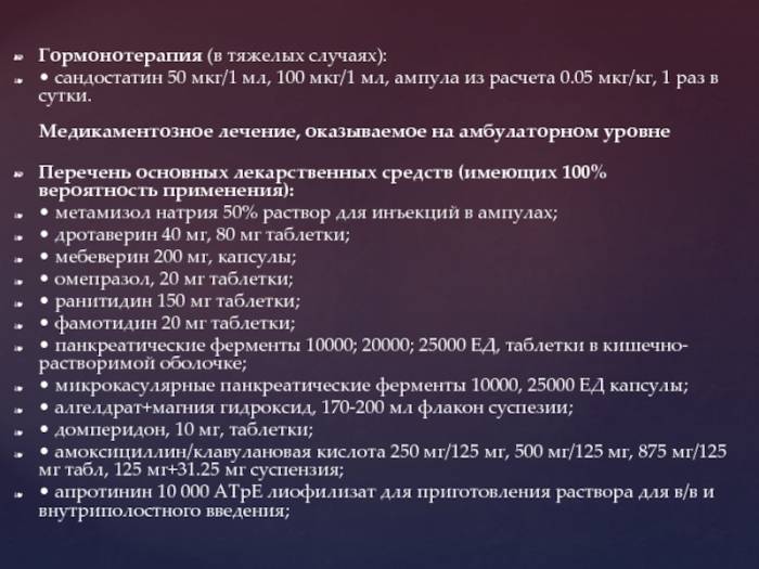 Перечень основных лекарственных средств (имеющих 100% вероятность применения):• метамизол натрия 50% раствор для инъекций в ампулах;• дротаверин 40 мг, 80 мг таблетки;• мебеверин 200 мг, капсулы;• омепразол, 20 мг таблетки;• ранитидин 150 мг таблетки;• фамотидин 20 мг таблетки;• панкреатические ферменты 10000; 20000; 25000 ЕД, таблетки в кишечно-растворимой оболочке;• микрокасулярные панкреатические ферменты 10000, 25000 ЕД капсулы;• алгелдрат+магния гидроксид, 170-200 мл флакон суспезии;• домперидон, 10 мг, таблетки;• амоксициллин/клавулановая кислота 250 мг/125 мг, 500 мг/125 мг, 875 мг/125 мг табл, 125 мг+31.25 мг суспензия;• апротинин 10 000 АТрЕ лиофилизат для приготовления раствора для в/в и внутриполостного введения;
