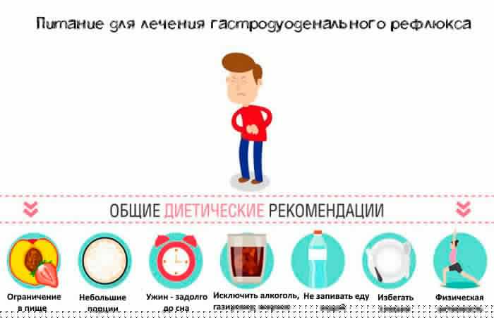 Успешное излечение гастродуоденального рефлюкса во многом зависит от точного следования предписанной гастроэнтерологом диеты. Помимо этого пациенту необходимо скорректировать пищевые привычки и руководствоваться общими правилами: