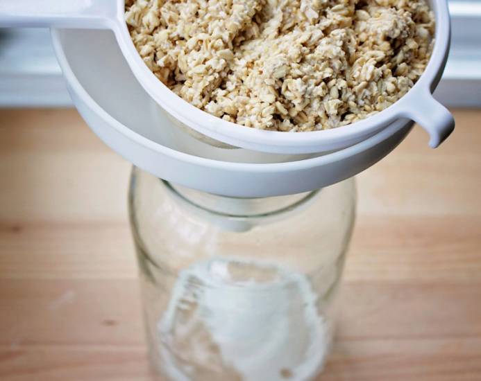 - Когда жидкость поднимется вверх, а овес выпадет в осадок, аккуратно процедите напиток. Перелейте кисель в чистую стеклянную банку, а жмых оставьте для приготовления каш.