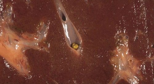 - Если в печени стремительно развиваются паразиты, то на повреждённых участках появляются рубцы, которые через некоторое время покрываются солевыми отложениями.