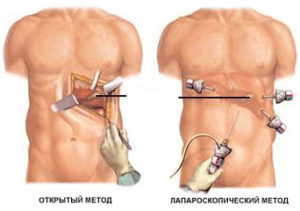 Хирургическое вмешательство проводят открытым способом или с использованием малоинвазивных методик, к которым относится лапароскопия.