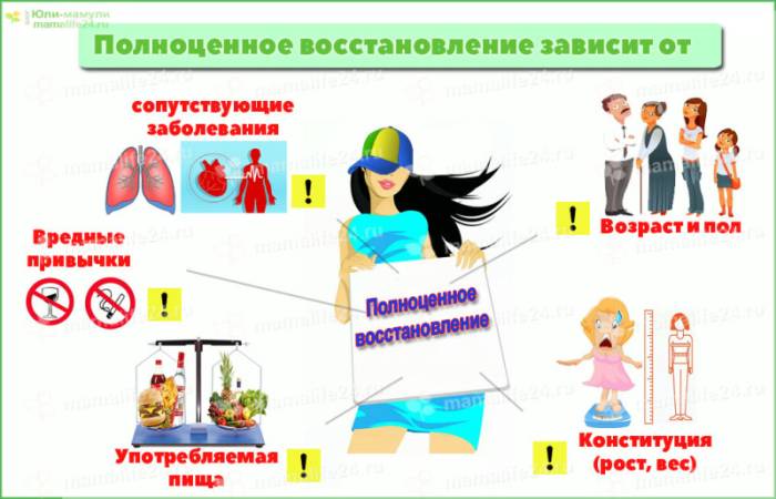 - Когда наступает полное выздоровление и сколько длится период восстановления? Организм полностью восстановится через месяц, если не будет осложнений. Но, длительность реабилитации зависит от особенностей самой пациентки.