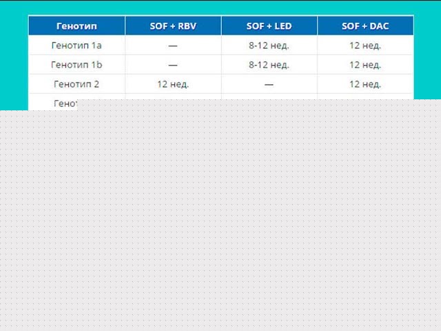 В таблице представлены схемы лечения гепатита С препаратом СОФ + ЛЕД, основанные на рекомендациях EASL по лечению гепатита С за 2016 год.