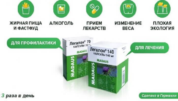 В инструкции по применению капсул «Легалон» 70 и 140 указан достаточно широкий список показаний, обусловленный универсальным терапевтическим действием силимарина. Сюда входят: