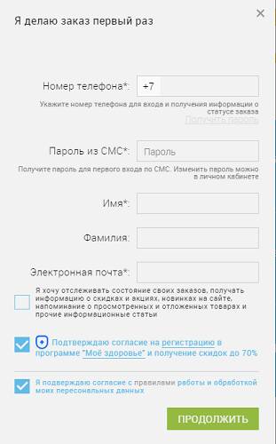 - Согласиться на SMS-информирование для отслеживания состояния заказов, регистрацию в программе лояльности «Моё здоровье». Также согласиться на обработку персональной информации и новостную рассылку.