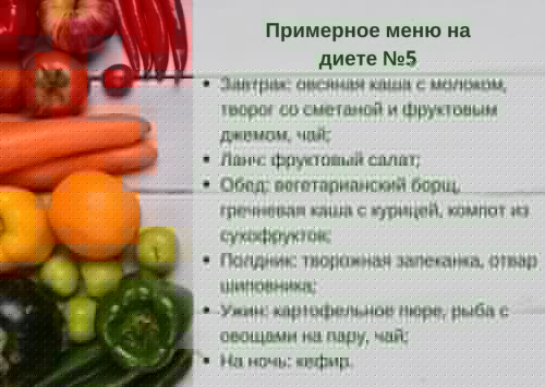 Стол №5В предполагает меньшую калорийность по сравнению с остальными. Как и в предыдущей модификации диеты, пищу готовят полужидкой консистенции, перетирают.