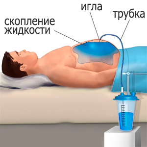 При отсутствии ожидаемого эффекта от консервативной терапии назначается оперативное вмешательство. Данная операция называется «лапароцентез». Он предполагает с помощью специальной иглы выведение из полости брюшины излишков жидкости. За одну процедуру убирается примерно 5 л.