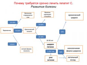 - В большинстве случаев — 70% после инфицирования человек приобретает хронический гепатит С. Поэтому все без исключения носители вируса должны регулярно обследоваться, наблюдаться у врача, поскольку риск активации вируса сохраняется у всех носителей до конца жизни.