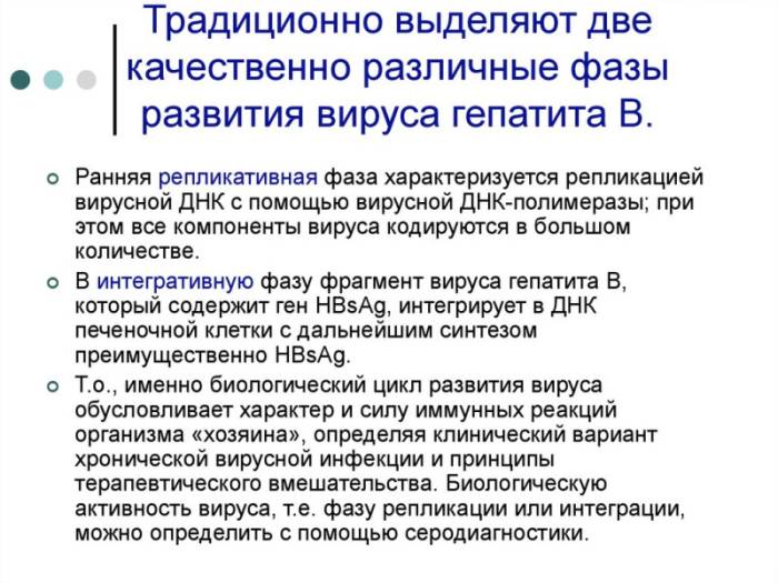Хронический вариант заболевания имеет стадийное протекание — фаза интеграции (вирус присутствует в организме человека, но не размножается) и фаза репликации (вирус активно воспроизводит сам себя).