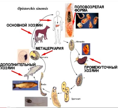 Вызывает развитие описторхоза печеночный сосальщик. Он попадает в человеческий организм в виде личинки.