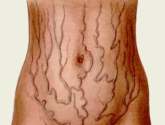 - Между околопупочными и нижней полой веной. Подкожные вены на животе, расходящиеся от пупка в стороны, похожи на извивающихся змей: их так и называют – «голова Медузы» (caput medusaе). Имеется в виду героиня греческих мифов – Медуза Горгона, у которой вместо волос на голове росли живые змеи. Признак, характерный при циррозе печени.