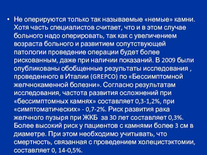что и в этом случае больного надо оперировать, так как с увеличением возраста больного и развитием сопутствующей патологии проведение операции будет более рискованным, даже при наличии показаний. В 2009 были опубликованы обобщенные результаты исследования , проведенного в Италии (GREPCO) по «Бессимптомной желчнокаменной болезни». Согласно результатам исследования, частота развития осложнений при «бессимптомных камнях» составляет 0,3-1,2%, при «симптоматических» — 0,7-2%. Риск развития рака желчного пузыря при ЖКБ за 30 лет составляет 0,3%. Более высокий риск у пациентов с камнями более 3 см в диаметре. При этом необходимо учитывать, что смертность, связанная с проведением холецистэктомии, составляет 0, 14-0,5%.