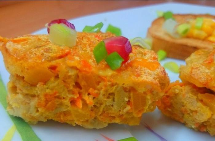 Свеклу и морковь среднего размера предварительно отварить, очистить и натереть на мелкой терке. Отдельно взбить до густой пены яичный белок и соединить с овощами. Разогреть духовку до 160 градусов, запекать 20 минут.