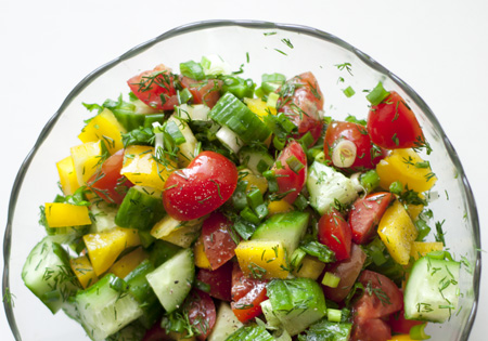 Два помидора, небольшой огурец, половину болгарского перца порезать на маленькие кубики. Ингредиенты перемешать, заправить оливковым маслом (1 ч. л.) или небольшим количеством нежирной сметаны.