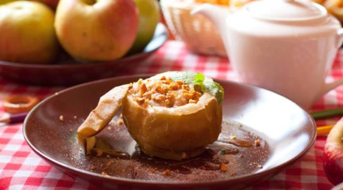 Сладкий десерт, богатый пектином и растительной клетчаткой, полезен не только для печени, но и всего ЖКТ. Для приготовления можно использовать мед или немного сахара. Из яблока среднего размера вырезать сердцевину, смазать медом. Для аромата можно посыпать ванилином. Запекать на противне в духовке. Сколько по времени, зависит от размера яблок, они должны стать мягкими.