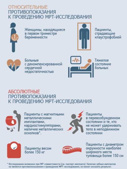 Сканирование не рекомендовано в 1 триместре беременности, людям с установленными кардиостимуляторами, протезами, инсулиновыми помпами, татуировками, выполненными металлосодержащими красками. Не проводится при избыточной массе — свыше 120 кг.