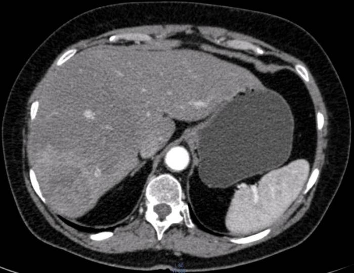 - Раковая опухоль. Такие очаговые образования в печени на КТ выглядят, как затемнения и имеют неровные края. Они быстро разрастаются до больших размеров, затрагивая любые сегменты.