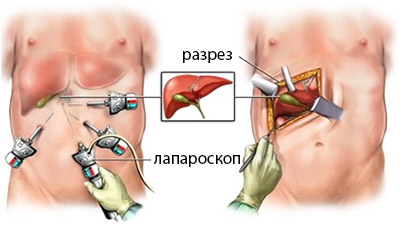 слева: лапароскопическая холецистэктомия, справа: открытая операция