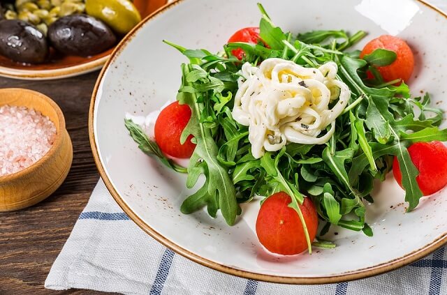 - На ужин приготовьте салат из отварной капусты с яичным желтком и кальмарами, съешьте немного риса, выпейте яблочный сок.