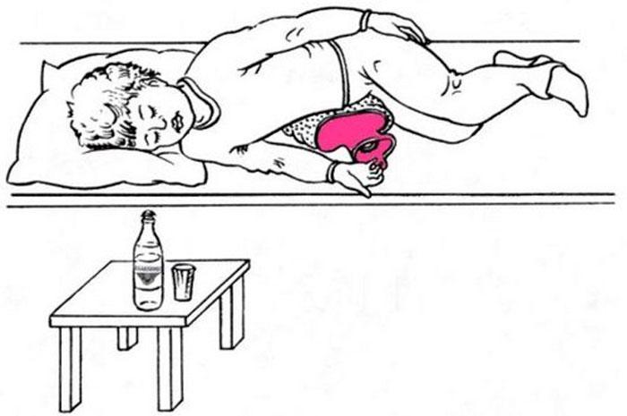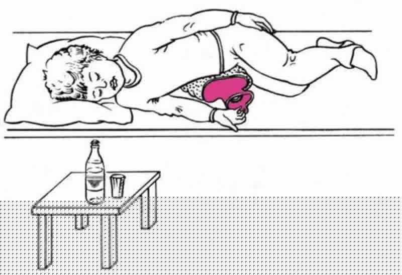 Укладываются на правый бок с теплой грелкой, которую прижимают к области печени.