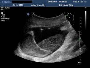 Мочевой пузырь на УЗИ: в норме он имеет симметричные контуры, внутри орган заполнен мочой (гиперэхогенная структура); но и помимо мочи, такое состояние может говорить и наличие гноя или крови; если стенки мочевого пузыря плотные, это может стать признаком цистита; во время увеличенного размера органа можно диагностировать мочекаменную болезнь.