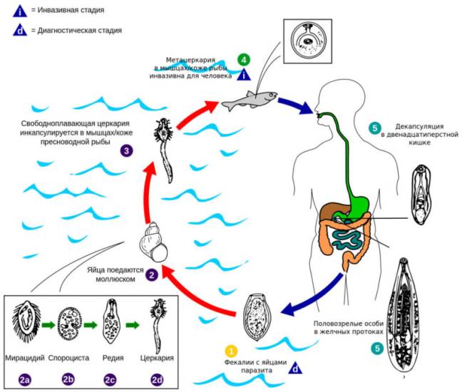 Личинки описторхов проникают в организм человека и локализуются в печени либо в желчном пузыре, со временем они достигают половой зрелости, начинают откладывать яйца. Примерно в течение 4-5 месяцев яйца превратятся во взрослых паразитов.