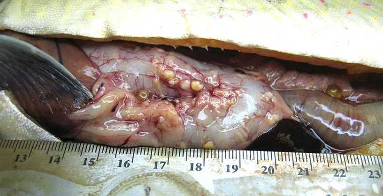Иногда описторхоз вызывается влиянием слишком маленьких паразитов, которых невозможно заметить невооруженным глазом. Тогда нужно посмотреть внутренности: у больной рыбы они издают отвратительный запах, не характерный для здоровой особи.