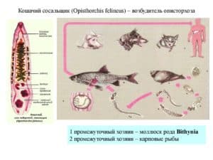 Возбудитель: двуустка сибирская, или кошачья двуустка (Opisthorchis felineus) паразитирует человека, кошек, собак в печени, желчном пузыре, поджелудочной железе.