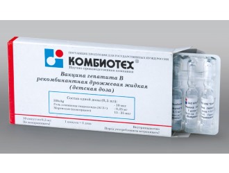 Вакцина против гепатита B, рекомбинантная. Применяется для детей от периода новорожденности и взрослых, выпускается в двух дозировках (10 и 20 мкг антигена). |