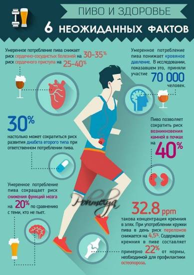 Если употреблять пенное изредка и в небольшом количестве, то вред для организма будет ничтожным. Следует выбирать живое пиво — без добавления консервантов. Обладает мочегонным эффектом.