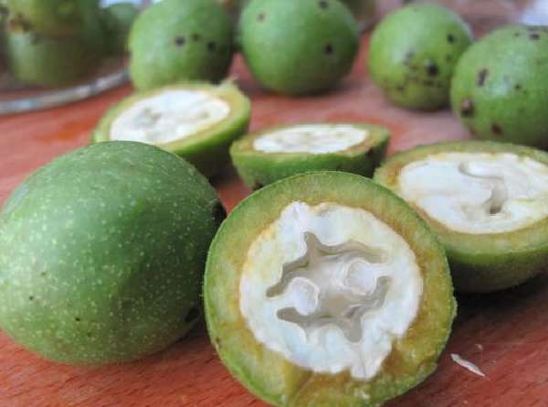 Зеленые грецкие орехи в это время считаются особенно полезными. Горсть очищенных ядрышек пропускают через мясорубку, добавляют немного майского меда и перемешивают до степени кашицы. Затем нужно залить равным объемом водки. Настойка готовится 30 дней. Пить можно по чайной ложке перед едой.
